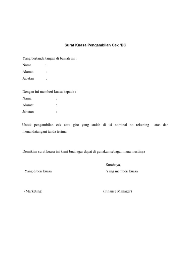 Surat Kuasa Pengambilan Cek Contoh Pdf